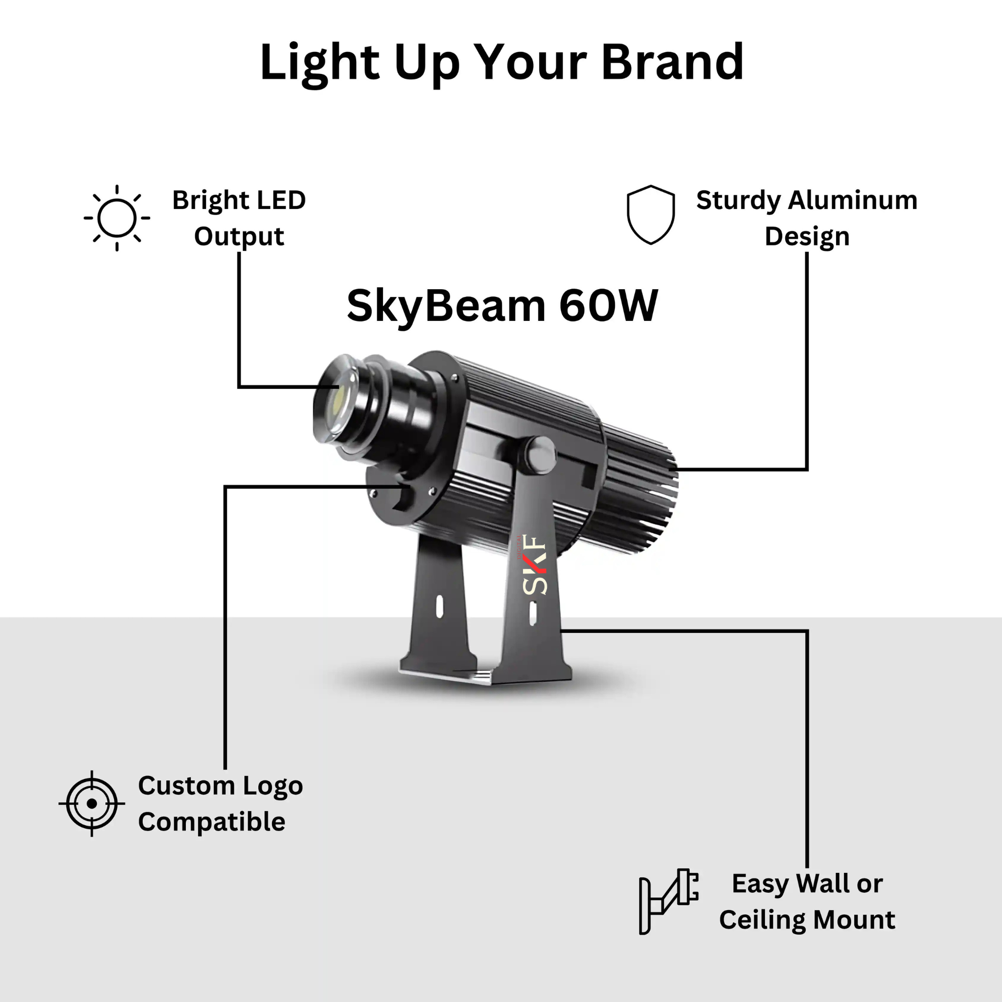 Make your brand shine brighter than ever with the SKF Digital 60W Logo Projector Light (Skybeam). Designed for both indoor and outdoor promotions, this powerful logo projector ensures your message is seen in style.